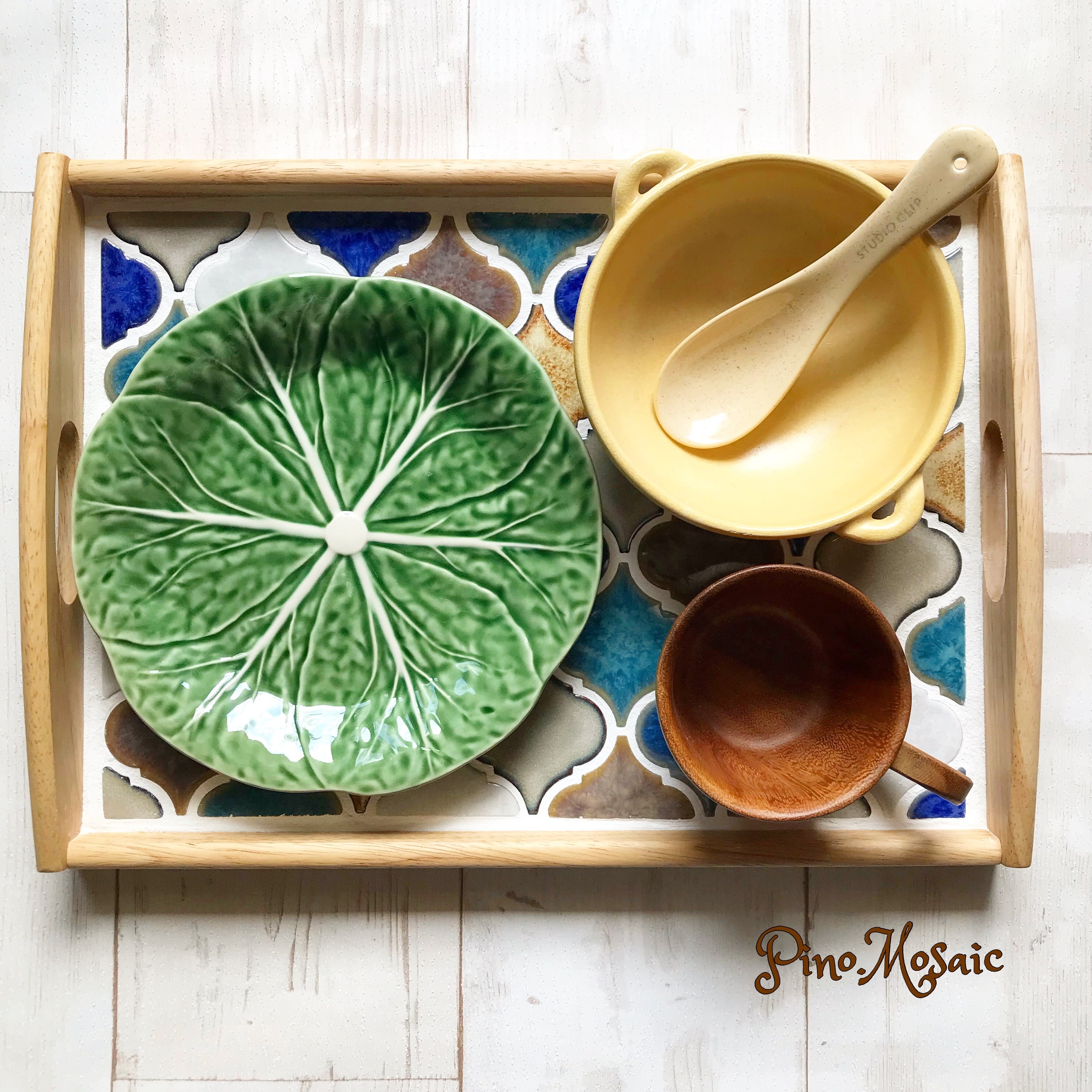 人気のコラベルタイルを使い、オシャレミックス色で仕上げました。カップ、お皿、小鉢をのせてやや余裕がある、配膳トレイとしてきちんと使える大きさです。また、このくらいの大きさでは最も持ち運びしやすい上方向の持ち手付きです。使わないときは立てかけておくとそれだけでオシャレなインテリアになります。キッチントレイ、カフェトレイの他、例えばホームパーティーの際の取り皿置き、飲み物置き、ナプキン置きなどに、また洗面所などでタオル置きなど場所を固定してインテリア的にお使い頂くのもオススメです♪その他、室内での花瓶敷きにもオススメです。オシャレなタイル尽くし、そして様々な用途に使える大きさのトレイ、お家に1個あると嬉しいお品です。