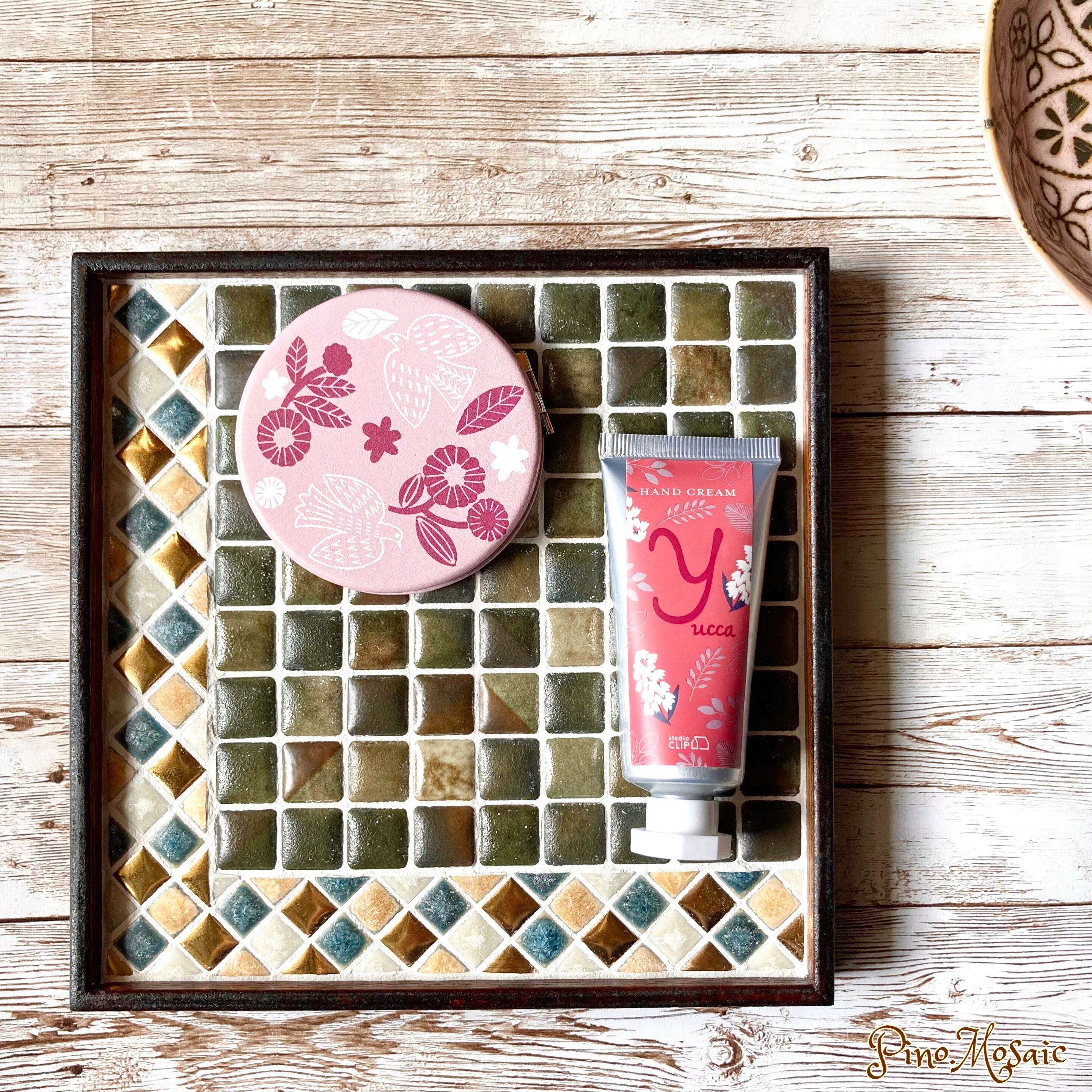 窯変タイルと金色のタイルで編み出される模様がとても綺麗なので、小物置きとして