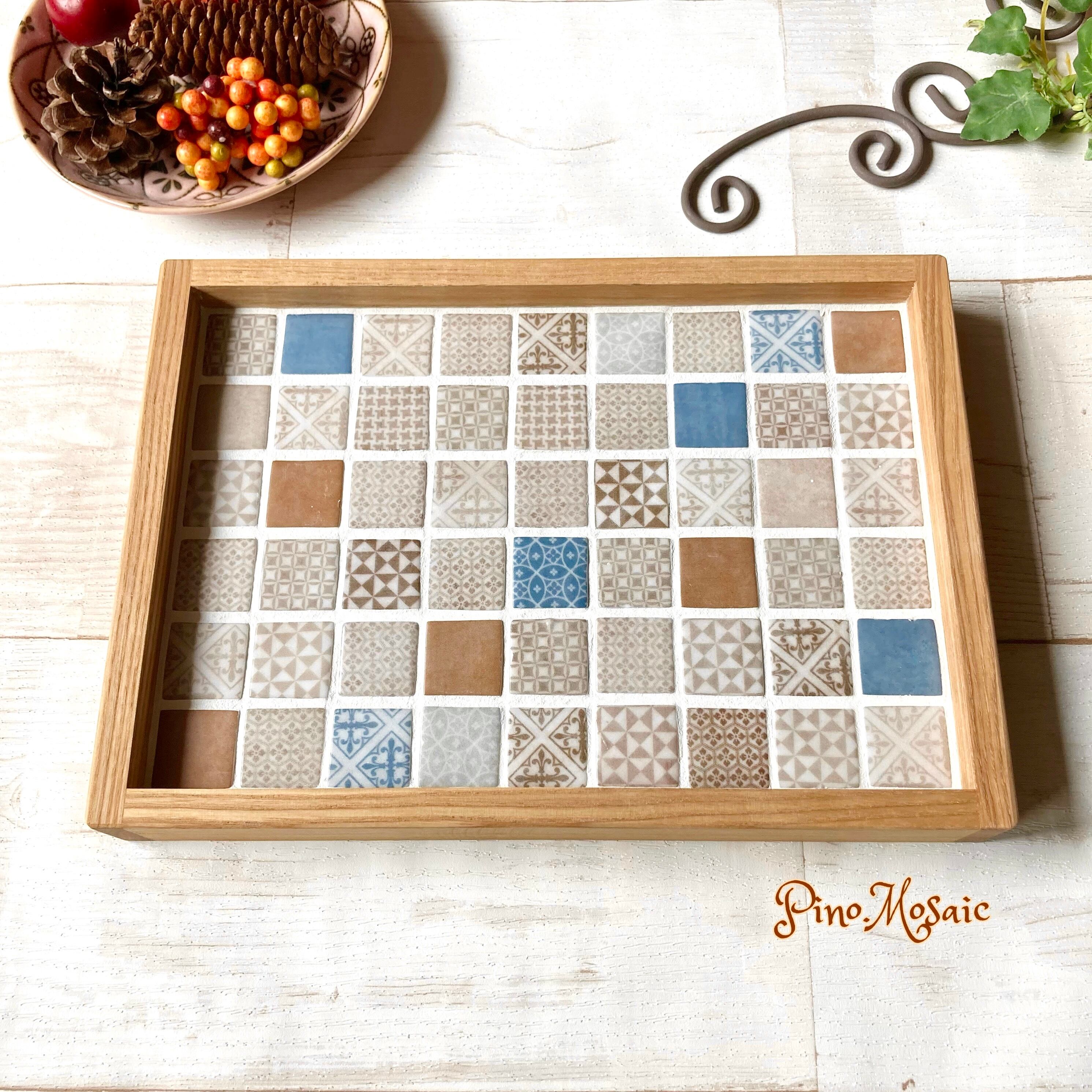 【1点モノ】かわいい柄タイルのモザイクタイルトレー(木枠:タモ材)